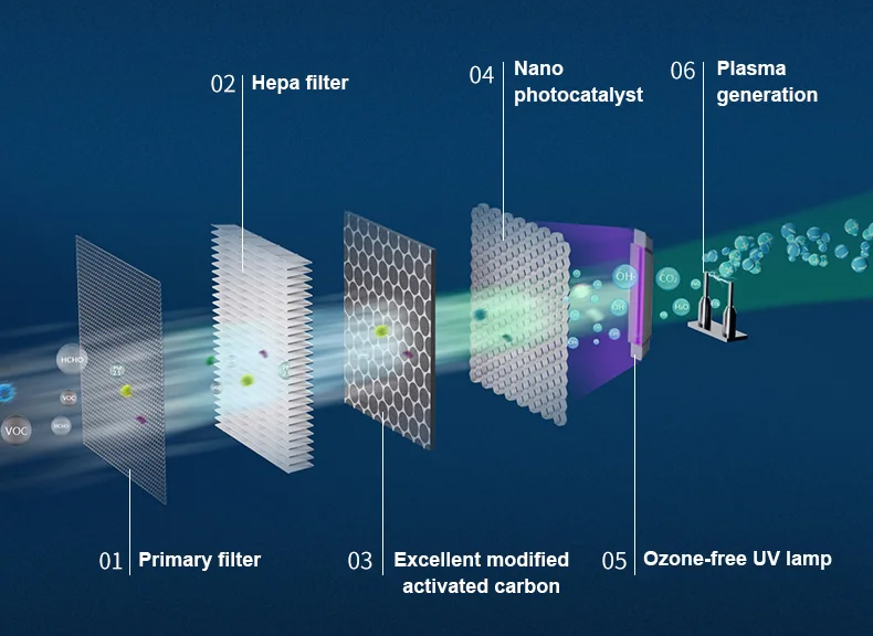 • Lọc 4 lớp: gồm màng sơ cấp, HEPA, than hoạt tính, và Plasma ion hóa
