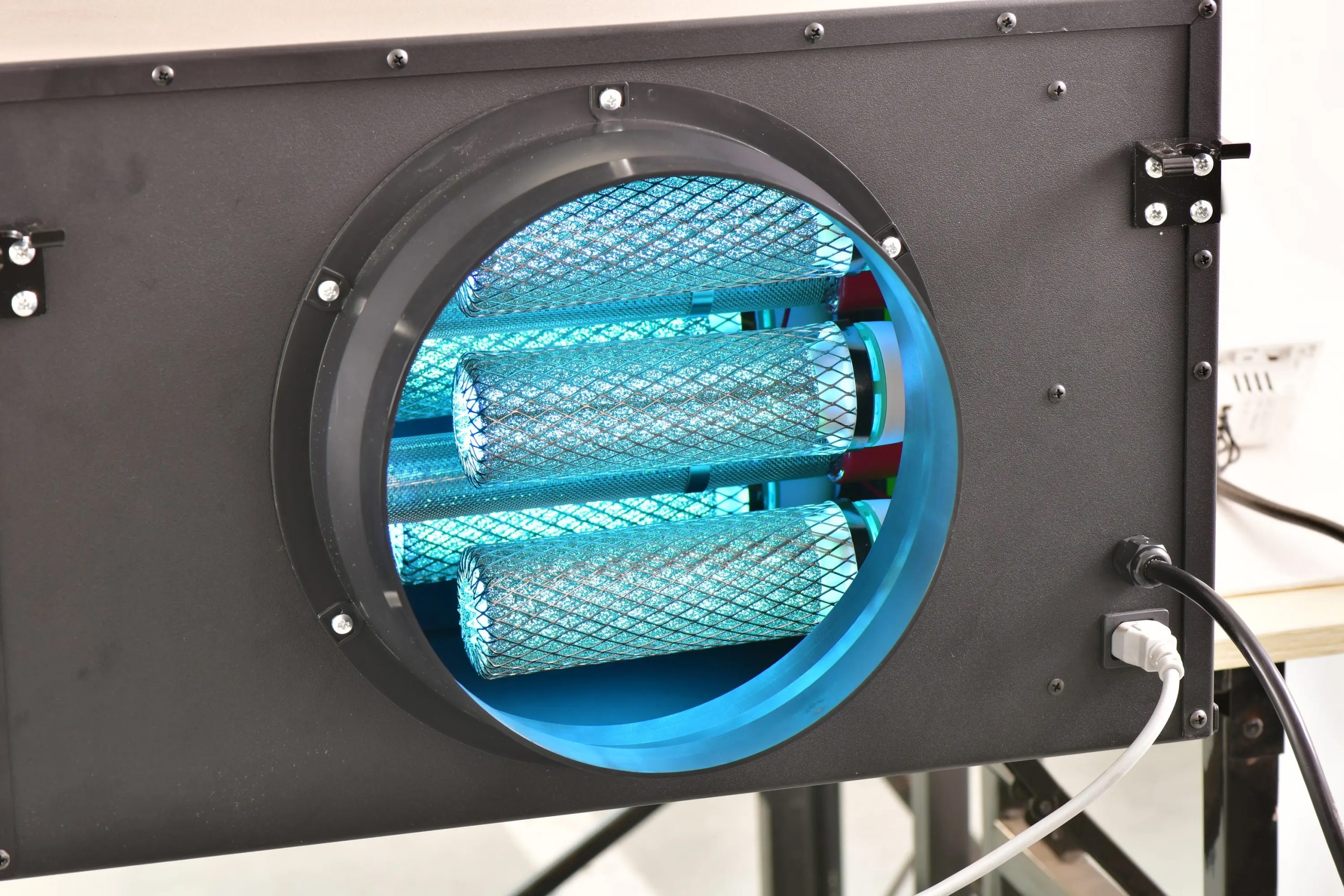 | 4. Buồng quang xúc tác UVC + TiO₂ | UVC (254 nm) kích hoạt TiO₂ tạo gốc •OH, phân hủy VOC thành CO₂ + H₂O, đồng thời diệt 99 % vi khuẩn/virus; nhiệt quang giúp tự tái sinh bề mặt carbon | “Không chỉ giữ – mà còn phá huỷ mùi & vi khuẩn” |